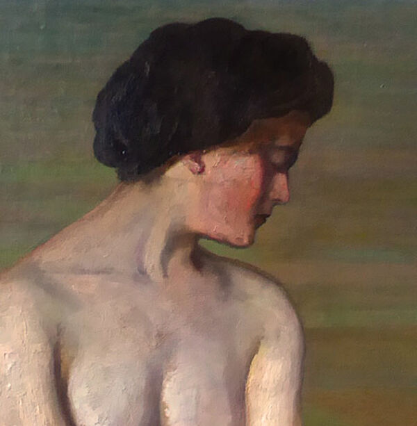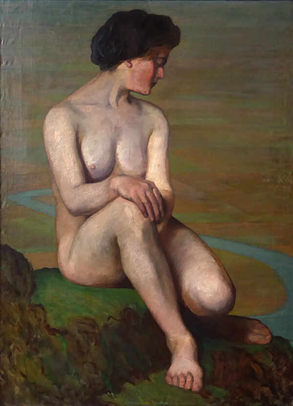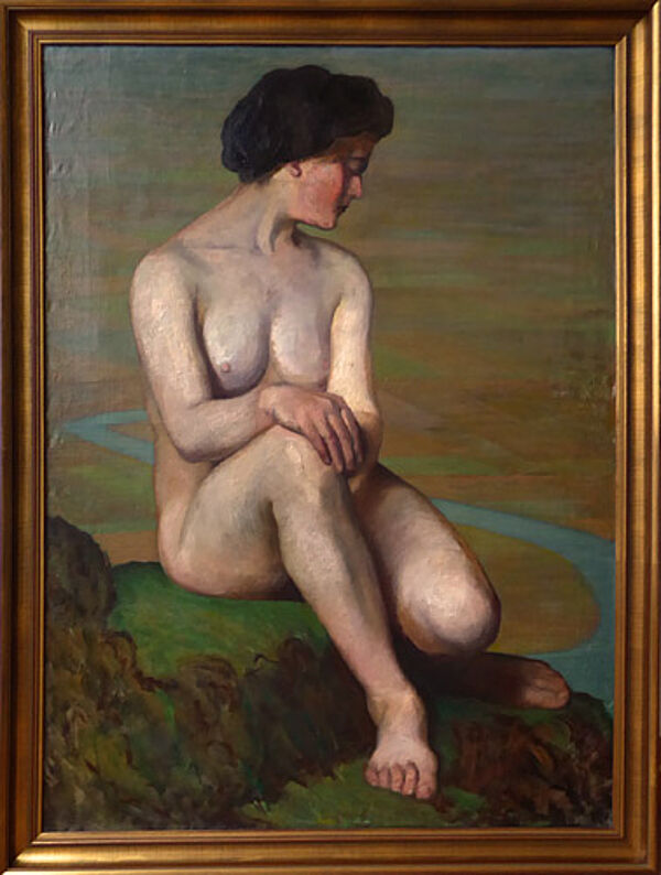 Ölgemälde: ohne Titel (Sitzender Frauenakt vor weiter Flusslandschaft)