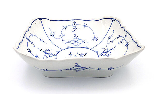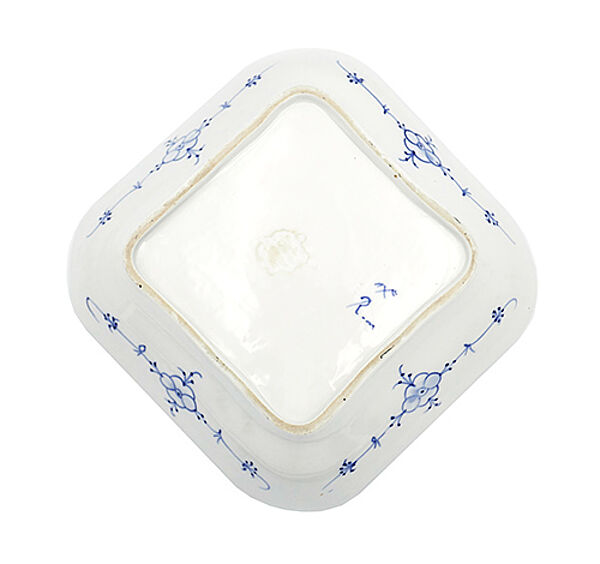 In der Aufsicht quadratische Form mit abgerundeten Ecken. Gewellter Rand, sich zum schmalen Fußbereich verjüngende Form. Handgemaltes, im Außenbereich z.T. ausgetuschtes Strohblumendekor. Maße ca. 22 x 22 cm, Höhe ca. 6,3 cm, geringe Alters- und Gebrauchsspuren. Unterseitig gemarkt mit blauer Fähnchenmarke und "Rn", die Marke wurde zwischen 1890 bis 1930 verwendet.
