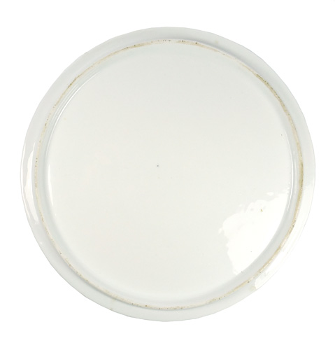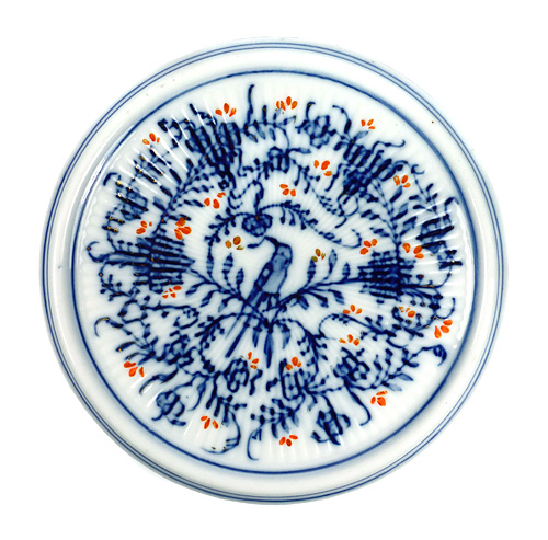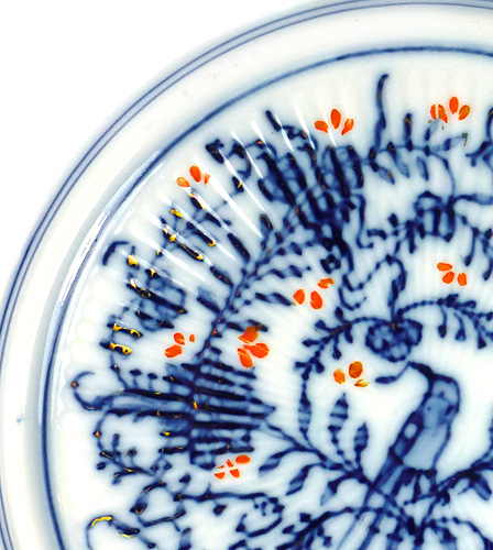 Scheibenförmiger, flach gemuldeter Porzellankorpus mir leicht gerippter Oberfläche und gering ausgestelltem Rand. Chinesoid-kobaltblaue Unterglasurmalerei (an Kornblumenmuster erinnernd), goldene und orangene Aufglasur-Akzente. Durchmesser ca. 18,5 cm, Höhe ca. 1,5 cm. Geringe Alters- und Gebrauchsspuren. Ungemarkt, wohl Rauenstein um 1910 bis 20.