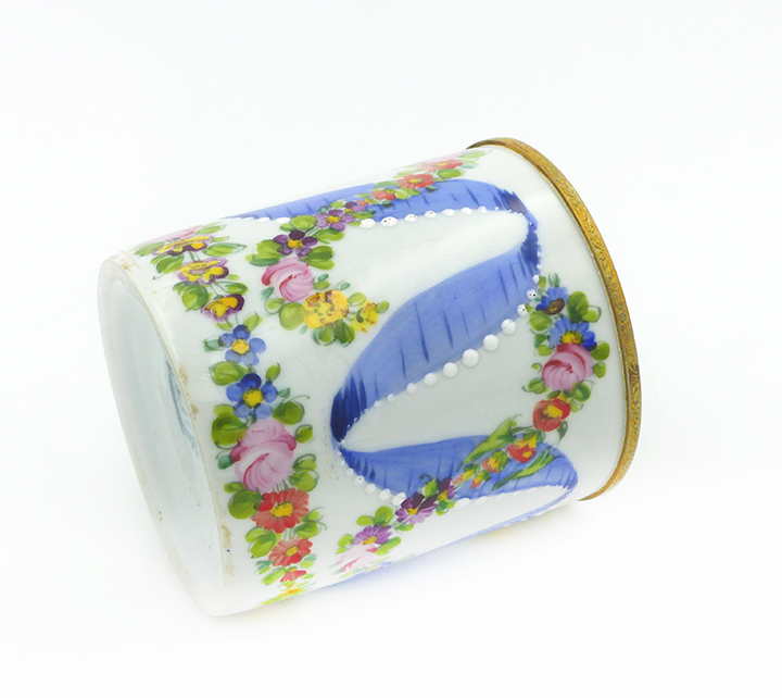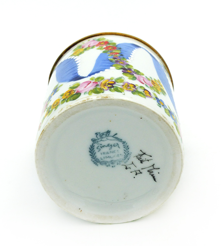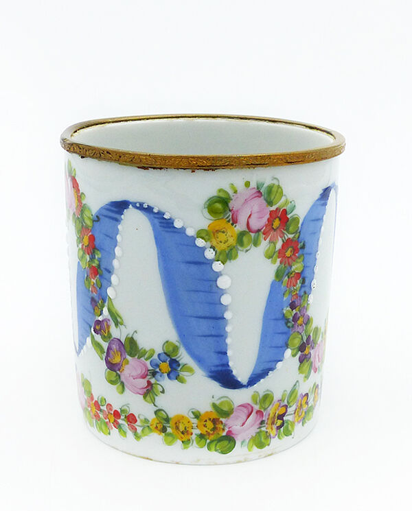 Annähernd zylindrischer weißer Porzellankorpus, dessen Rand mit einem feuervergoldeten, zart floral reliefierten Bronzereif besetzt ist. Handmaltes, polychromes Blumen- und Banddekor. Höhe ca. 7,5 cm, Durchmesser im oberen Randbereich ca. 7 cm, geringe Altersspuren. Unterseitig Markung und handgeschriebene Signatus des Porzellanmalers (?). Wohl um 1900.