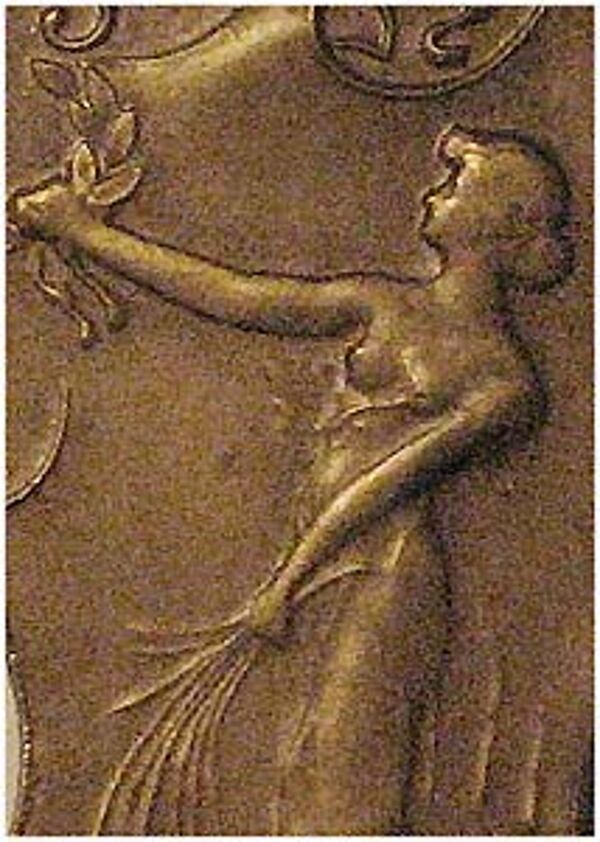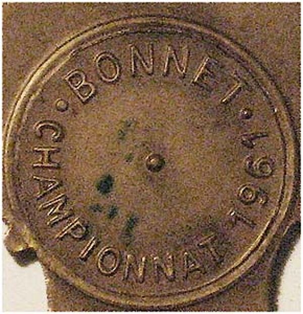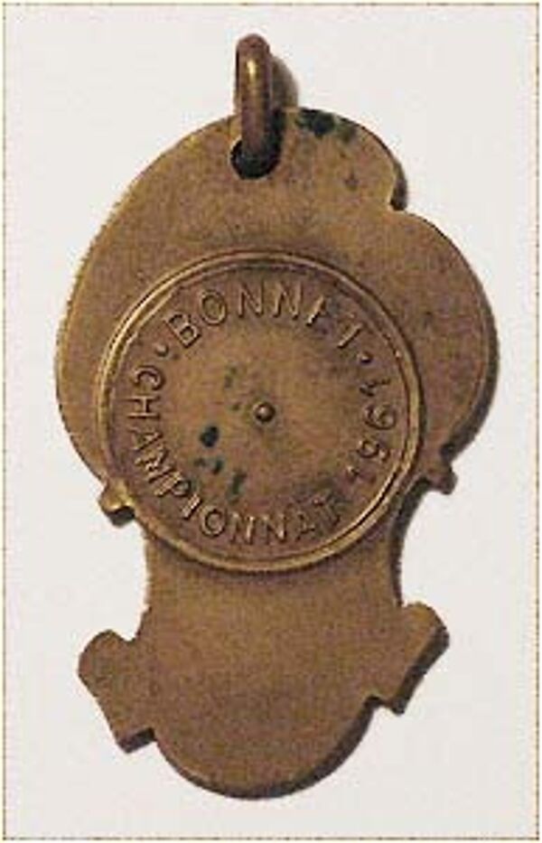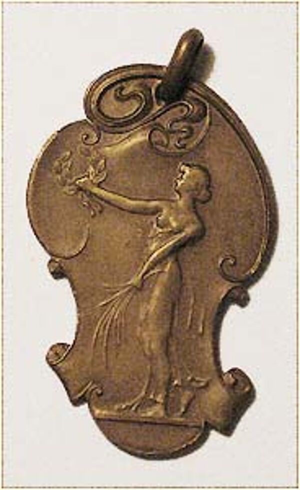 Der Bronze-Korpus hat eine leicht asymmetrische, z.T. konvex, z.T. konkav geschweifte Begrenzung. Vorderseitig ist flach reliefiert eine spärlich bekleidete Frau dargestellt, die einen Lorbeer-Kranz hält. Rückseitig kleine, aufgesetzte Scheibe mit der Bezeichnung "BONNET CHAMPIONNAT 1961". Am oberen Rand Ringöse. Warme, fast gleichmäßige Patina, diskrete Gebrauchsspuren. Länge (gemessen mit Öse) ca. 4 cm. Wohl Frankreich oder Belgien um 1900, d.h. zumindest der Entwurf stammt aus der Zeit, vermutlich aber auch die Medaille selbst, wobei die Prägung der rückseitig aufgesetzten Scheibe dann später erfolgte.