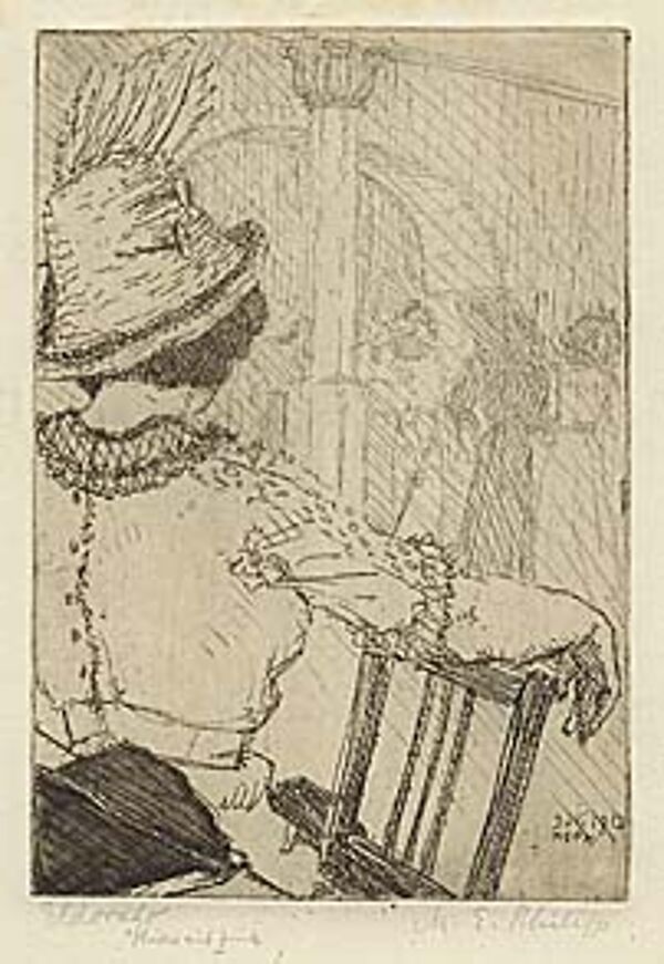 Radierung mit einer Plattengröße von ca. 17,8 x 12 cm, Blattmaße ca. 28 x 18 cm, Ecken leicht bestoßen, rückseitig oben Klebespuren. Von Hand bezeichnet "Eldorado, Studie auf Zink", signiert und datiert Juli 1912, WVZ Götze A 77.