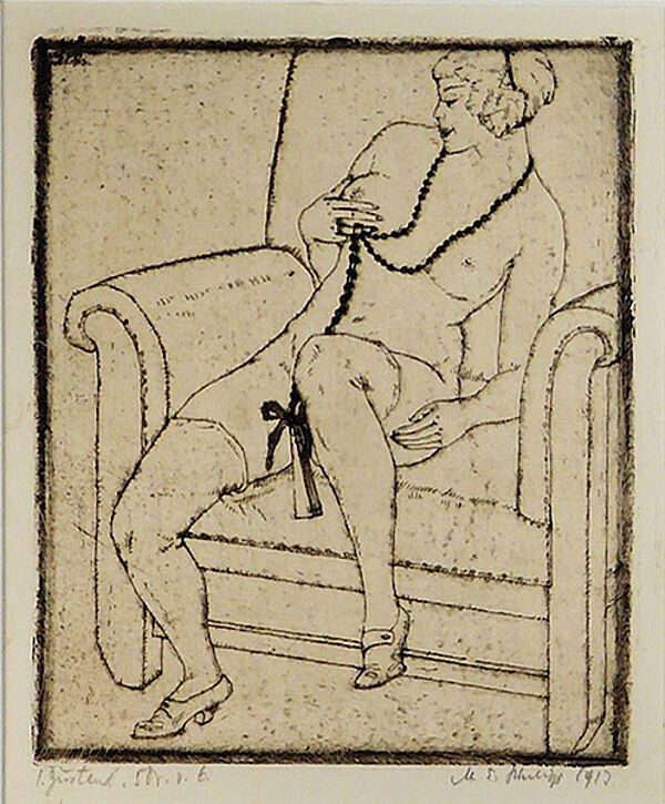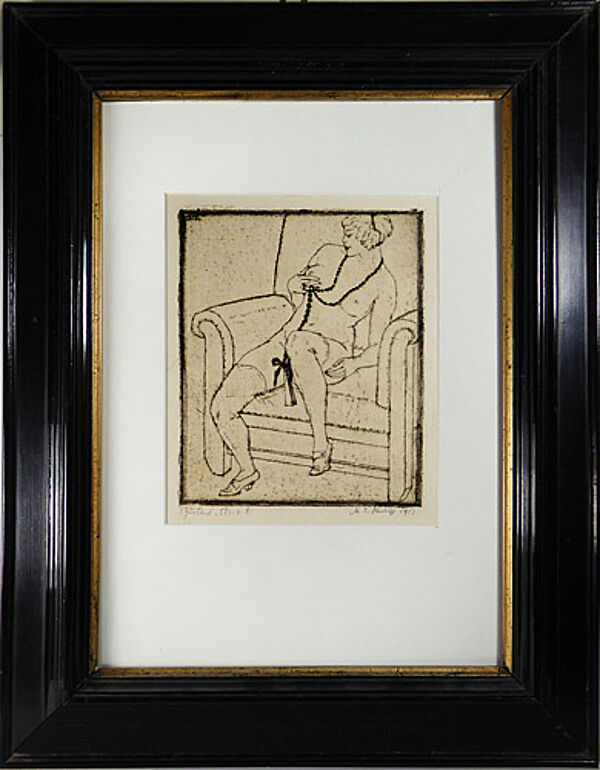 Radierung auf leicht chamoistonigem Papier, rechts unterhalb der Darstellung mit Bleistift handsigniert und datiert "1912", links unterhalb der Darstellung bezeichnet: "1. Zustand 5 Dr. v. 6", im alten, gekehltenm innenseitig fein goldfarben abgesetzten Schelllackrahmen. Plattenmaße ca. 16 x 13,5 cm, Rahmenaußenmaße ca. 42,5 x 33 cm, geringe Altersspuren.