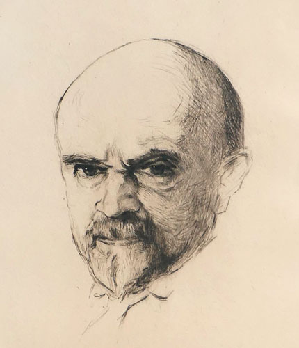 Radierung auf leicht chamoistonigem Bütten, mit Bleistift rechts unterhalb der Darstellung handsigniert. Blattmaße ca. 42 x 33 cm, Bildmaße ca. 32,5 x 24,5 cm, geringe Alters-, Griff- und Lagerspuren. Aus der XIV. Jahresgabe der Freunde Graphischer Kunst.