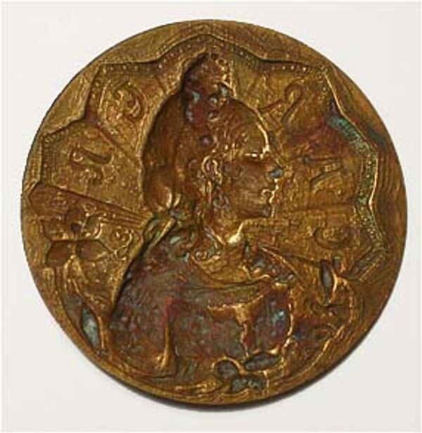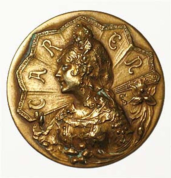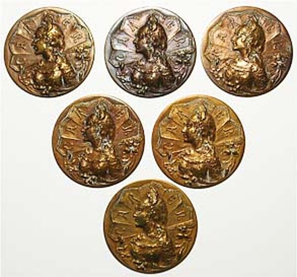 Jeweils scheibenförmiger, einseitig geprägter Korpus aus Bronze, wobei rückseitig die Ösen fehlen. Vorderseitig Frauenbüste im Profil nach links vor fächerartigem Gebilde, hier Bezeichnung "CAREN", im unteren Randbereich Blumen-Motiv, rechts seitlich ligiertes Monogramm, wohl "CS" (ungedeutet). Durchmesser ca. 4 cm, diskrete Gebrauchs- und ältere Putzmittelspuren, die Patina der Knöpfe variiert leicht im Ton. Wohl Frankreich um 1900/05.