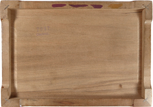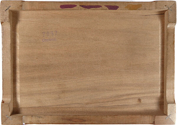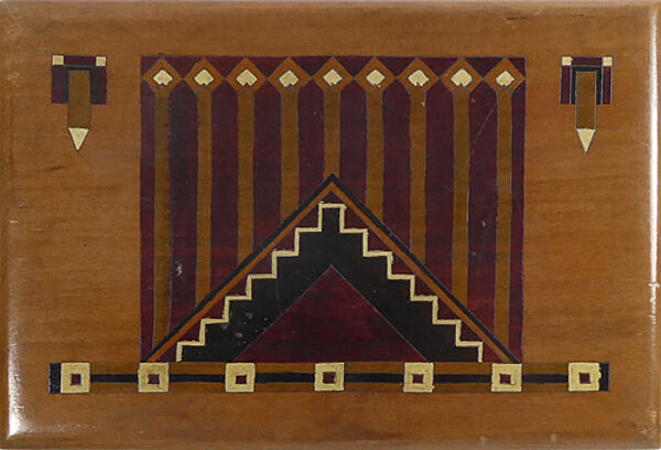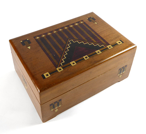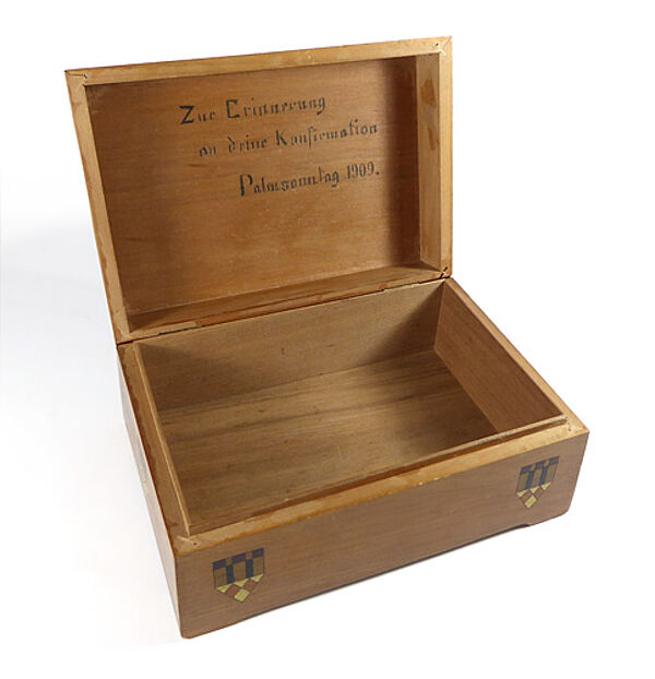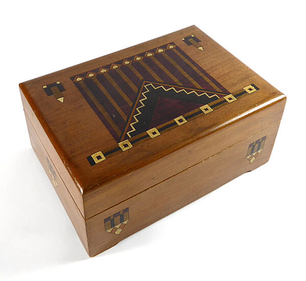 Rechteckiger, truhenartiger Holzkorpus mit scharniertem Deckel. Seitlich und oberseitig geometrisches Linien- und Streifendekor in der Intarsien imitierenden, sogenannten Tarso-Technik, die 1904 vom Münchner Schreiner Hermann Schilling patentiert wurde. Innenseitig im Deckel handschriftliche Widmung: "Zur Erinnerung an deine Konfirmation 1909". Maße ca. 20 x 14 x 9 cm, geringe Altersspuren.
