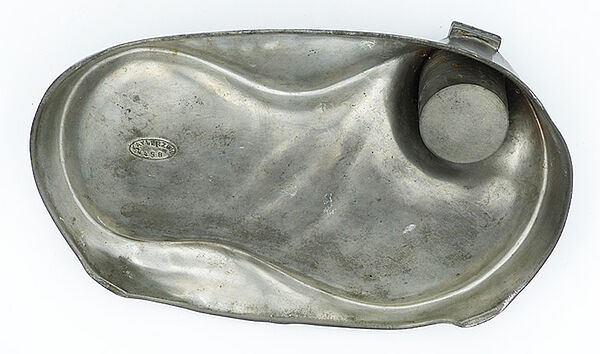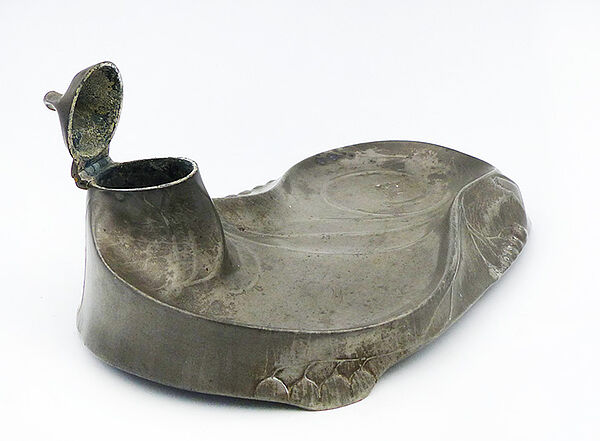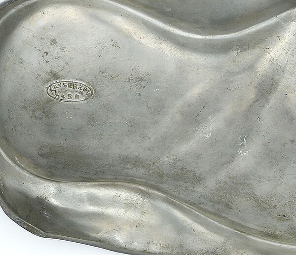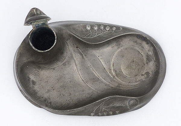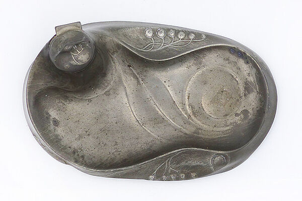 Organisch geformter, mittig flach schalenförmiger, nach hinten-seitlich "fließend" in das Tintenfass übergehender Zinnkorpus mit flach reliefiertem, stilisiertem Beerendekor. Maße: ca. 7 x 21,5 x 13,5 cm, geringe Patina, der Einsatz vom Tintenfass fehlt, Stand etwas uneben, sonst eher geringe Altersspuren. Unterseitig Ovalmarke mit Modell-Nr. "4438" sowie weitere, ungedeutete, geprägte Nummer "25". Entwurf wohl von 1901 oder 02.