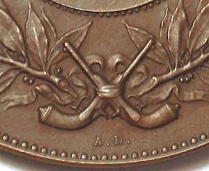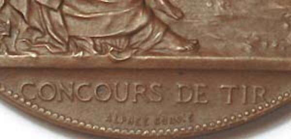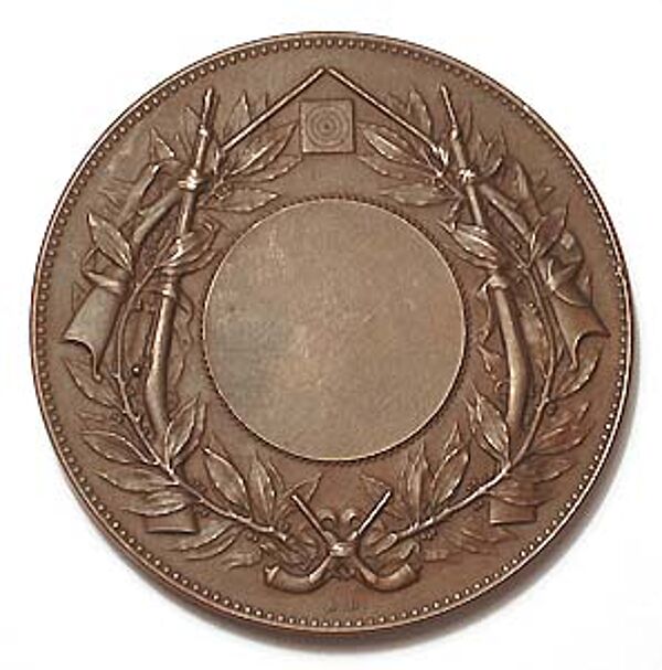 Die Bronzemedaille zeigt vorderseitig ein griechisch gewandtetes Paar: eine junge Frau hält sitztend einen (Lorbeer?)Zweig, hinter ihr steht ein Jüngling mit einer Fahne. Im Hintergrund kann man mehrere Schützen erkennen. Im unteren Anteil bezeichnet "CONCOURS DE TIR" und signiert. Rückseitig Gebinde aus Waffen und Lorbeer (?), unten monogrammiert A.D., Durchmesser ca. 5 cm, fast gleichmäßige, warme Patina, minimale Gebrauchsspuren. Wohl um 1890.