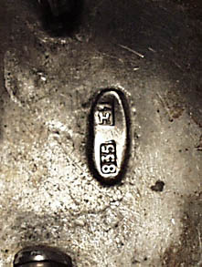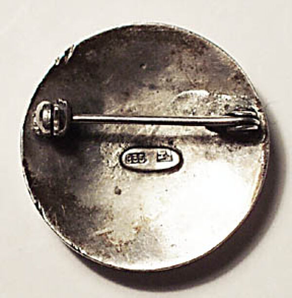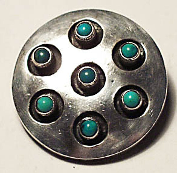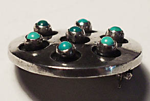Scheibenförmiger Silberkorpus (935er) der vorderseitig minimal konvex gewölbt ist und sieben runde Vertiefungen aufweist, worin jeweils zentral ein kleiner Türkis-Cabochon in Zargenfassung montiert ist. Altersentsprechende Gebrauchsspuren (siehe Foto), Durchmesser ca. 2,7 cm. Rückseitig Sicherheitsbroschierung mit Kugelkopf, Silberpunze und Markung. Wohl um 1910.