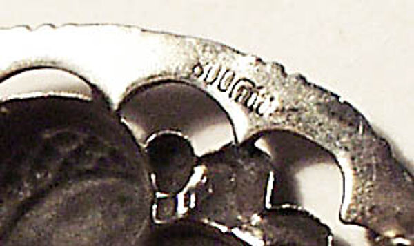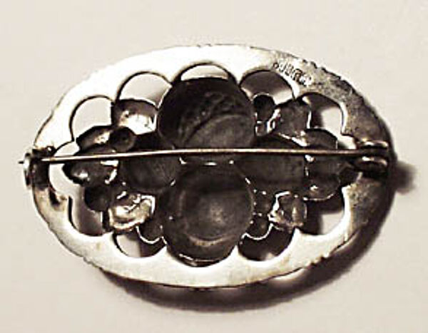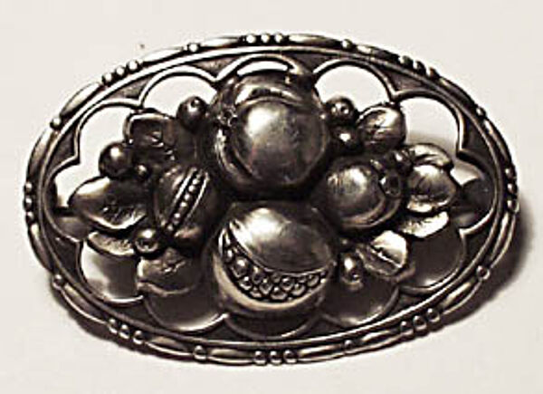 Ovaler, durchbrochener Silberkorpus (800er) mit zentral geprägtem Obstdekor (m.E. Granatäpfel). Ungeputzter Zustand, Durchmesser ca. 4 cm. Rückseitig Sicherheitsbroschierung mit Kugelkopf, Silberpunze und Markung: partiell umrandetes "TH", siehe Foto. Wohl um 1915.