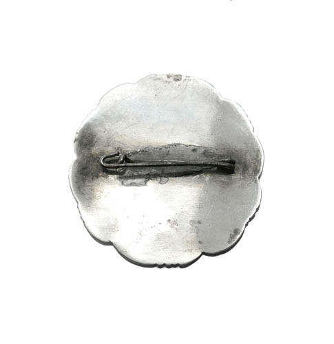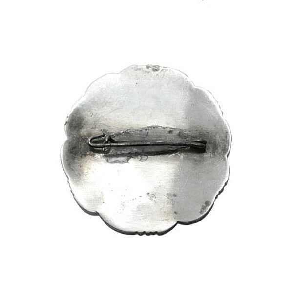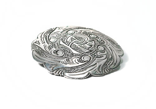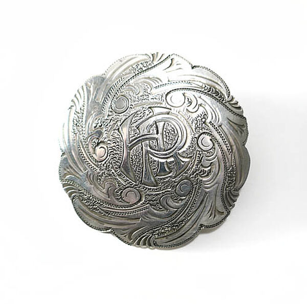 Annährend runder, leicht gewölbter Silberkorpus (geprüft) mit gewelltem Rand. Vorderseitig oppulentes, handgraviertes Rocaillen-artiges Dekor, welches mittig ein ligiertes Monogramm "HR" umschließt. Durchmesser ca. 4,5 cm, ungeputzter Zustand mit geringen Tragespuren. Rückseitig einfache Broschierung. Ungemarkt, wohl Deutschland der 1910er Jahre.