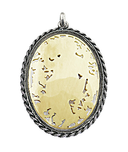 Hochovaler Korpus, der mittig eine feine Elfenbeinschnitzerei zeigt (einen in Weinreben sitzenden Putto). Umsäumt wird selbige von einem feinen Silberrahmen (geprüft), dem außen ein silbernes Kordelband aufsitzt. Oberseitig einfache, bewegliche Öse. Maße ca, 4,2 x 3,2 cm, Länge mit Öse ca. 5,2 cm, ungeputzter Zustand mit geringer Patina und leichten Tragespuren. Ungemarkt, wohl München der 1910er Jahre.