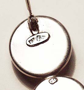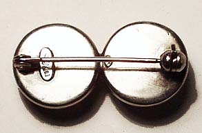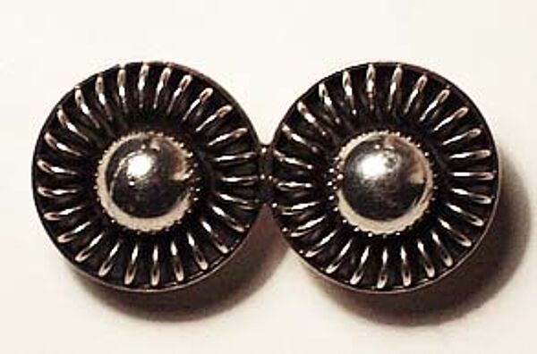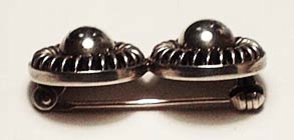 Silberkorpus (835er) in Form zweier aneinander grenzender Scheiben, die jeweils - um eine zentrale Halbkugel gruppiert - im Randbereich eine Reihe von Bogen-Elementen aufweisen. Länge ca. 3,3 cm, ungeputzter Zustand mit geringen Gebrauchsspuren. Rückseitig Sicherheitsbroschierung mit Kugelkopf sowie Markung, wohl um 1910/15.