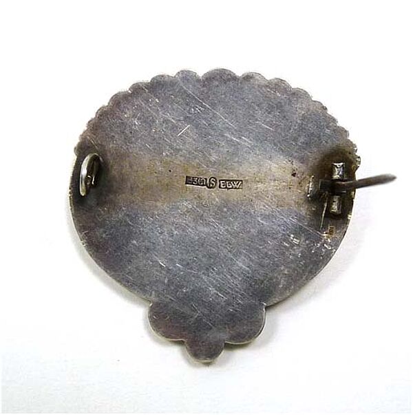 Handgetriebener, gebödeter Silberkorpus (835er) in Form eine stilisierten Blume, zentral befindet sich eine Blüte, in die ein roter Cabochon (Granat?) in Zargenfassung integriert ist, oberseitig Perlrand mit beidseitigem Verlauf zur Mitte. Maße ca. 4,2 x 4 cm, ungeputzter Zustand mit leichter Patina und moderaten Tragespuren. Rückseitig einfache Broschierung und Markung. Wohl um 1905/15.