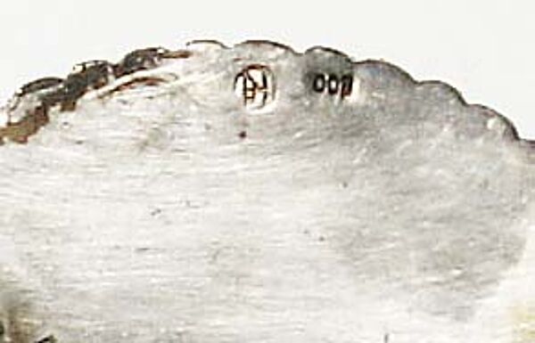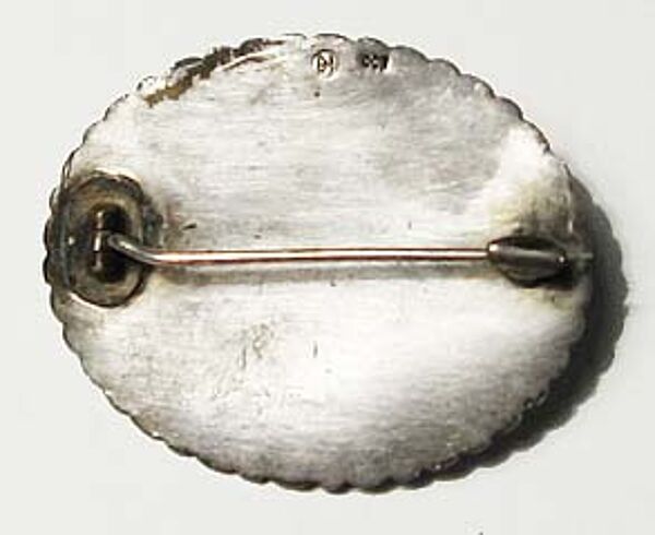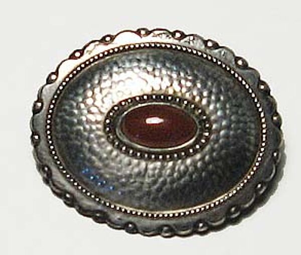 Querovaler, vorderseitig leicht gewölbter, handgearbeiteter, gebödeter Silberkorpus (800er) mit leicht gewelltem Rand und z.T. Hammerschlagdekor. Mittig Karneol(?)cabochon in Zargenfassung. Breite ca. 40 mm, ungeputzter Zustand mit leichter Patina und geringen, rückseitig moderaten Tragespuren. Hier Markung (ungedeuet) und einfache Broschierung. Wohl Deutschland um 1910 / 15.