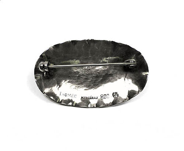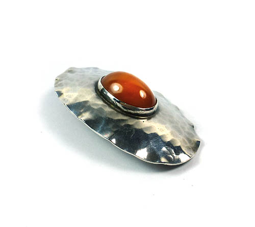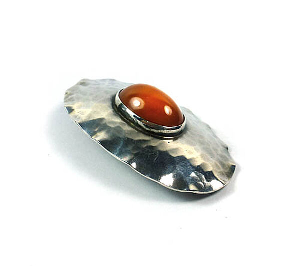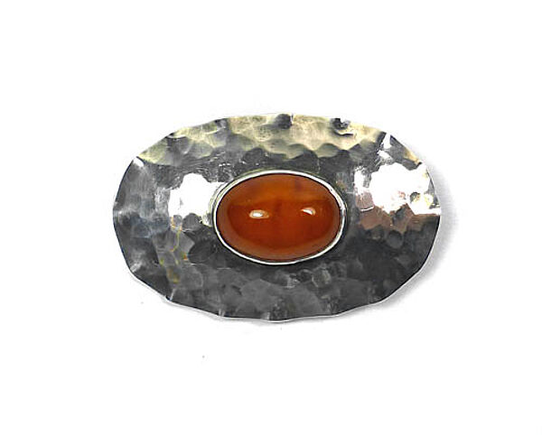 Querovaler, leicht gewölbter Silberkorpus (800er) mit akzentuiert martellierter Oberfläche, mittig befindet sich ein ovalärer Karneol-Cabochon in Zargenfassung. Maße ca. 4,3 x 2,5 cm, gereinigter Zustand mit geringen Tragespuren. Rückseitig Markung und Sicherheitsbroschierung mit Kugelkopf. Wohl um 1915.