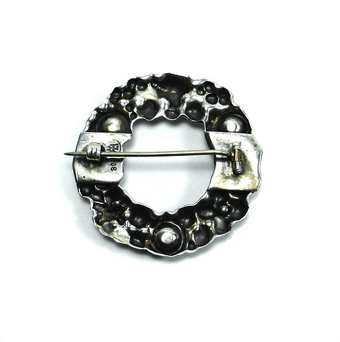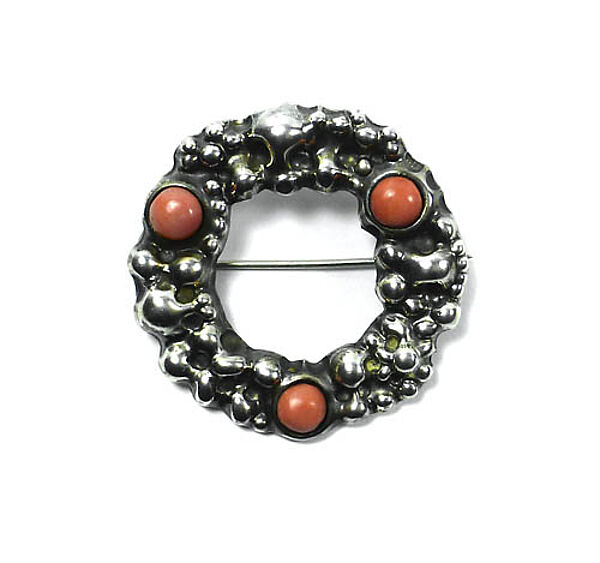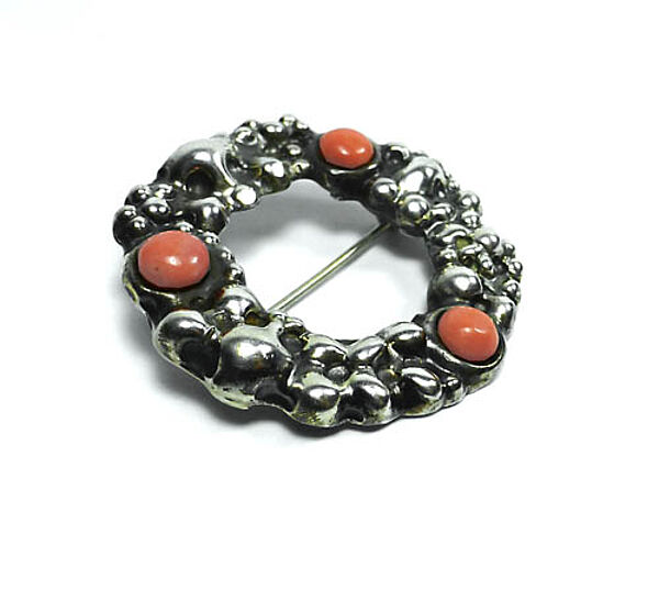 Ringförmiger, schwerer Silberkorpus (800er), mit unregelmäßiger, noppenartiger, recht expressiv wirkender Oberfläche in der - quasi als "Ruhepol" - drei lachsrote Korallen-Cabochons in Zargenfassung integriert sind. Außendurchmesser ca. 4 cm, ungeputzter Zustand mit leichter Patina und geringen Tragespuren. Rückseitig einfache Broschierung und Markung mit legiertem "HL" im Rechteck. Sie ist ein "Mix" aus den mir bekannten, ebenfalls legierten Levinger-Marken im Rechteck (mit den Jugendstil-Buchstaben) und im Kreis (mit den schlichten, nüchternen Buchstaben). Vermutlich zwischen 1910 und 20.