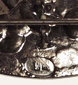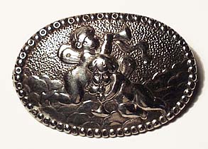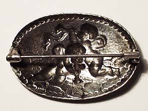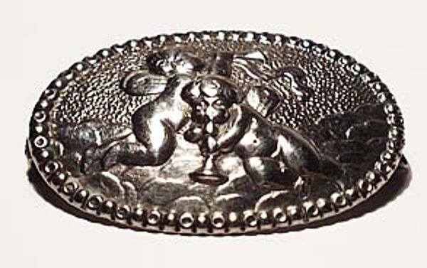 Ovalärer, leicht gewölbter Silberkorpus (800er) mit plastischer Darstellung zweier Engel bzw. Putten über Wolkenlandschaft, Flachrelief, Breite ca. 4,3 cm. Ungeputzter Zustand mit geringen Tragespuren. Rückseitig Sicherheitsbroschierung mit Kugelkopf sowie Markung, wohl um 1910.