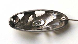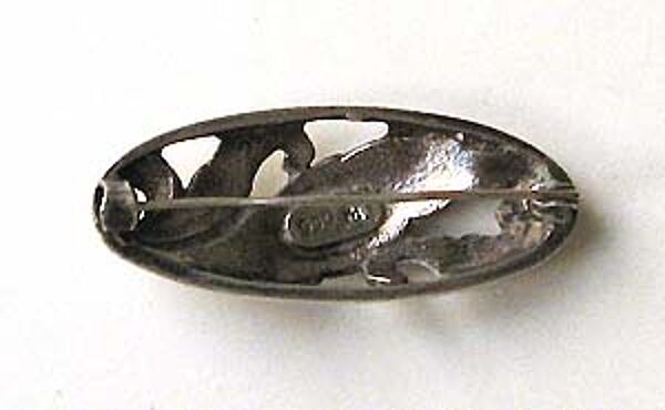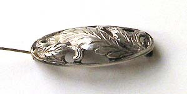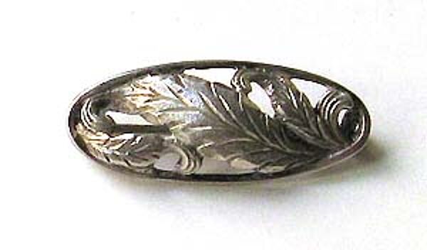 Der querovale, offen gearbeitete Silberkorpus (900er) besteht aus einem Randsteg, der mehrere plastisch ausgearbeitete Blätter umschließt. Rückseitig einfache Broschierung und Markung. Maße ca. 40 x 16 mm. Leichte Patina und diskrete Gebrauchsspuren. Wohl um 1915.