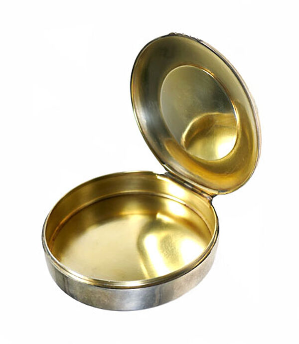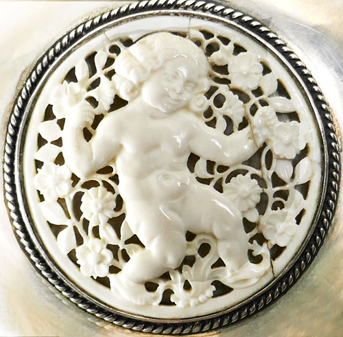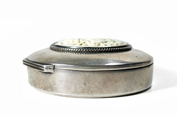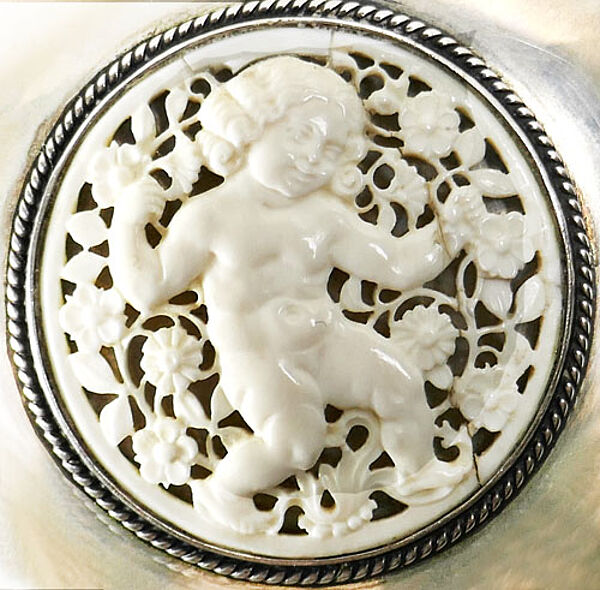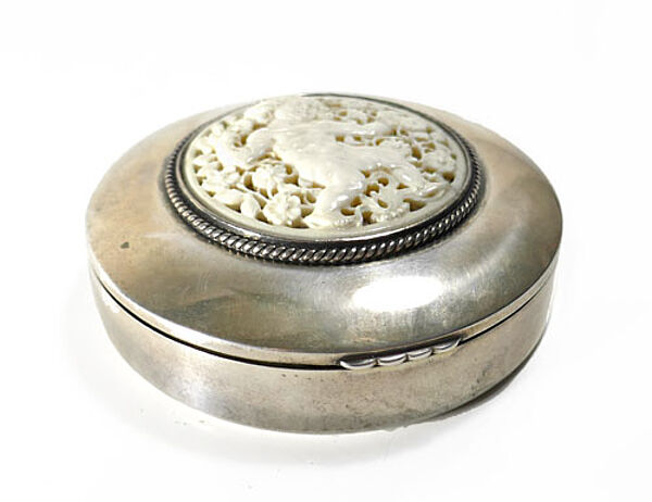 Runde, scharnierte, innen vergoldete Silberdose (800er). Oberseitig medaillonartige, feine, handgeschnitzte Elfenbeinschnitzerei in Zargenfassung mit umlaufendem Zierband. Dargestellt ist ein Putto in einem Blumengeflecht. Durchmesser ca. 7,6 cm, Höhe ca. 3 cm, am oberen Elfenbeinrahmen war ein kleines Stück des Steges ausgebrochen und wurde wieder eingesetzt, so dass zwei Haarrisse zu sehen sind. Ungeputzter Zustand mit leichter Patina und geringen Altersspuren. Unterseitig Markung. Wohl um 1900 bis 1915.