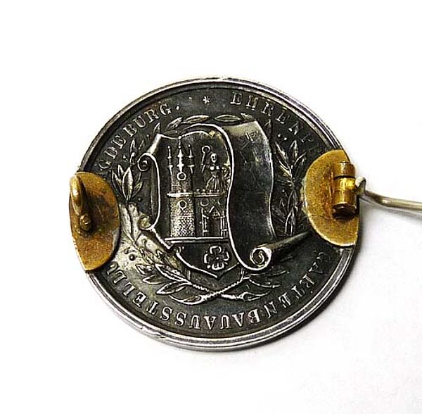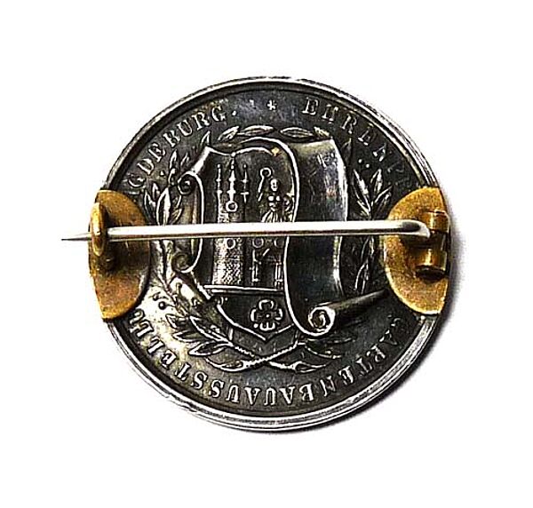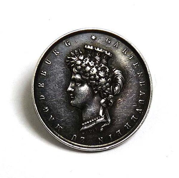 Vorderseite: blumenumrankter, bekrönter Frauenkopf (wohl Flora) nach links, im Randbereich bezeichnet GARTENBAUVEREIN ZU MAGDEBURG. Rückseite: Wappen von Magdeburg, im Randbereich bezeichnet EHRENPREIS GARTENBAUAUSSTELLUNG MAGDEBURG. Hier aufgelötete, einfache Broschierung (die m.E. ohne Beschädigung der Medaille ggf. entfernt werden könnte). Durchmesser ca. 2,8 cm, ungeputzter Zustand mit teilweise dunkler Patina und geringen Griff- bzw. alten Putzspuren. Wohl um 1885 / 1895.