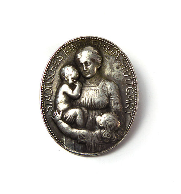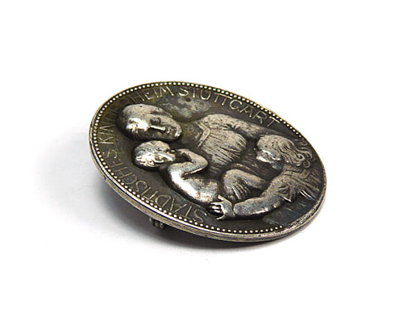 Hoch-ovaler, flach reliefierter Silberkorpus (900er): dargestellt ist eine Kinderkrankenschwester, die einen kleinen Jungen auf dem Arm trägt und von einem kleinen, zu ihr aufschauenden Mädchen umarmt wird. Entlang bzw. unterhalb des oberen und jeweils seitlichen Randbereiches verläuft die Bezeichnung: "STÄDTISCHES KINDERHEIM STUTTGART". Maße ca. 3,5 x 2,9 cm, ungeputzter Zustand mit etwas ungleichmäßiger, moderater Patina und geringen Tragespuren. Rückseitig Sicherheitsverschluss mit Kugelkopf sowie Markung. Die Brosche könnte zur Gründung des Kinderheimes, also 1915 herausgegeben worden sein.