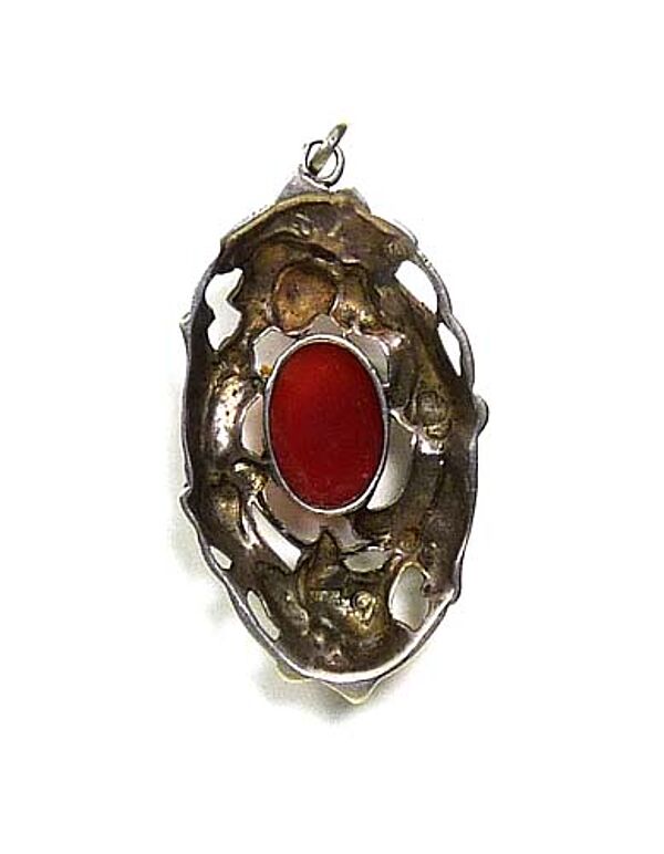 Hoch-ovaler, z.T. durchbrochener, halbplastisch gearbeiteter Silberkorpus: mehrere dicht aneinander gereihte, etwas stilisierte Blätter umrahmen einen Karneol-Cabochon (ca. 1,4 cm) in Zargenfassung. Oberseitig einfache Öse. Länge mit Öse ca. 5 cm, Breite ca. 2,5 cm, ungeputzter Zustand mit leichter Patina und geringen Tragespuren. Ungemarkt, wohl Deutschland oder Dänemark um 1910/15.
