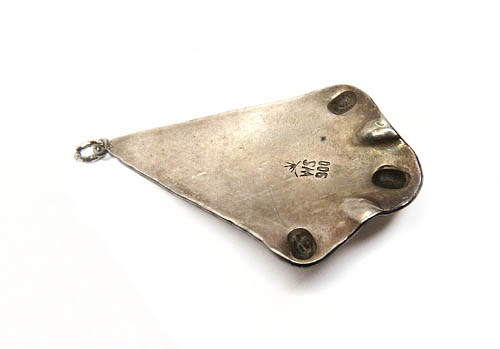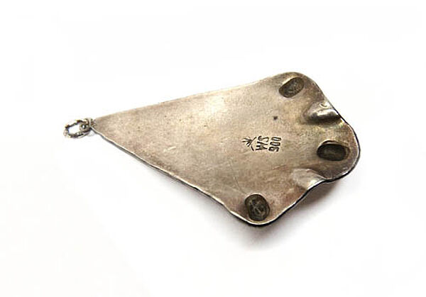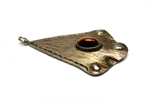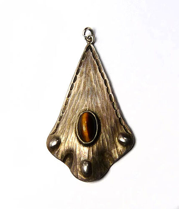 Annähernd rhombenförmiger, handgetriebener, recht expressiver Silberkorpus (900er) mit zentralem, hoch-obalen Tigeraugen-Cabochon in Zargenfassung. Neben einem gleichmäßigen Hammerschlagdekor zeigt sich eine strichförmige Punzung entlang der beiden seitlichen Ränder sowie entlang der unteren Begrenzung drei konvexe und zwei konkave Noppen. Oberseitig kleine, runde, starre Öse (mit einem beweglichen Kettenglied). Länge des Anhängers ca. 4,5 cm (ohne Öse), Maße des Cabochons ca. 1 cm x 0,6 cm. Ungeputzter Zustand mit leichter Patina und geringen Tragespuren. Rückseitig ungedeutete Markung ("WS" und eine Art Strahlensymbol), wohl Deutschland um 1915.