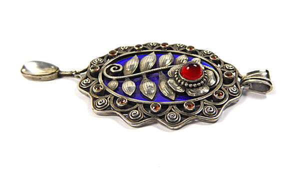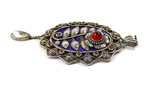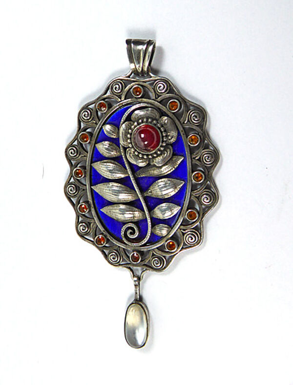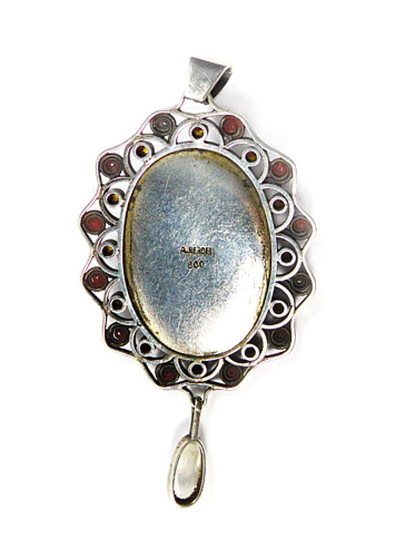 Großer, handgefertigter, aufwendig gearbeiteter, hochovaler Silberkorpus (800er): der wellenartig begrenzte, offen angelegte Rand integriert eine Reihe kleiner, zargengefasster roter Schmucksteine (evtl. Granate). Mittig befindet sich eine leuchtend blaue, ovale Emailleplatte, auf diese ist ein fein getriebener, stilisierter, flach reliefierter Zweig mit vielen Blättern und einer Blüte (diese ebenfalls mit rotem Schmuckstein) aufgesetzt. Oberseitig annähernd dreieckig konfigurierte, beweglich Öse. Unterseitig ist ein ovaler Mondstein-Cabochon in Zargenfassung beweglich abgehängt. Maße des Ovals ca. 5,5 x 4,1 cm, Gesamtlänge mit Öse und Anhängsel ca. 8 cm. Ungeputzter Zustand mit leichter Patina und geringen Alters- und Tragespuren. Rückseitig Markung "A. Berdel" (ungedeutet), wohl Deutschland oder Österreich um 1905 bis 20.