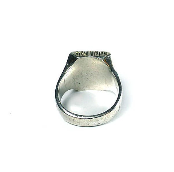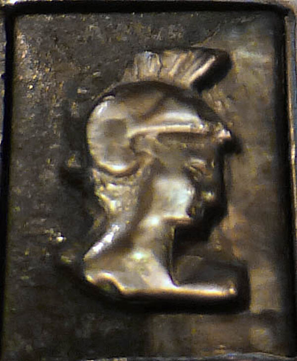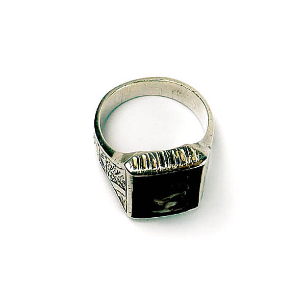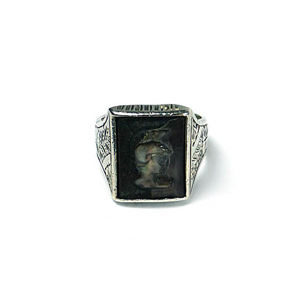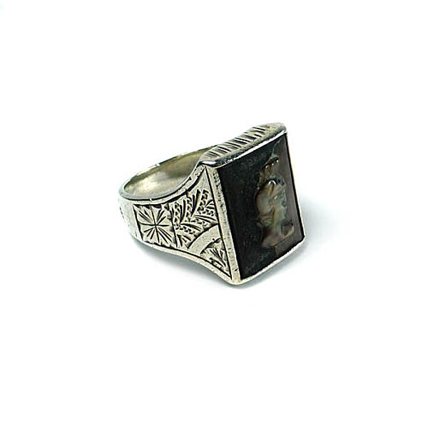 Silberner Korpus (800er) mit breiter Ringschiene, die vorallem im Bereich der Schultern ein punziertes, stilisiert-florales Dekor aufweist. Der Ringkopf wird fast vollständig von einer im Flachrelief beschnitzten Perlmuttplatte in Zargenfassung ausgefüllt, die den behelmten Kopf eines Kriegers im Profil nach rechts darstellt. Maße des Ringkopfes ca. 1,7 x 1,5 cm, Ringinnendurchmesser ca. 20 mm (Ringgröße 63), ungeputzter Zustand mit diskreter Patina und geringen bis allenfalls moderaten Alters- und Tragespuren. Ungemarkt, wohl Deutschland um 1895 bis 1910.