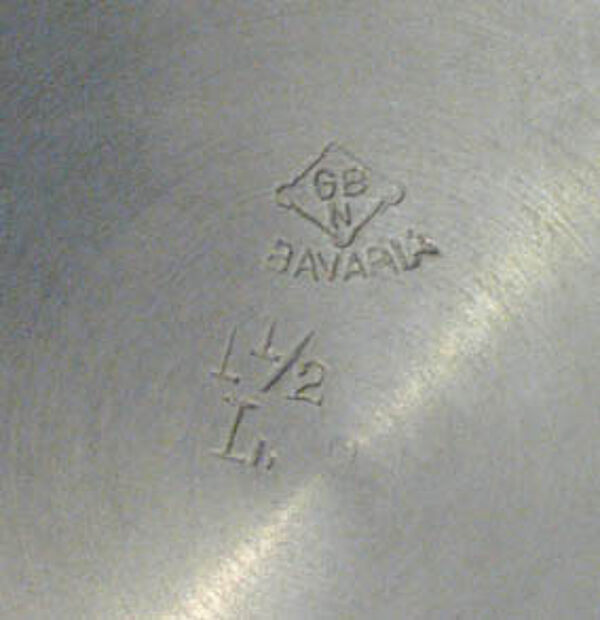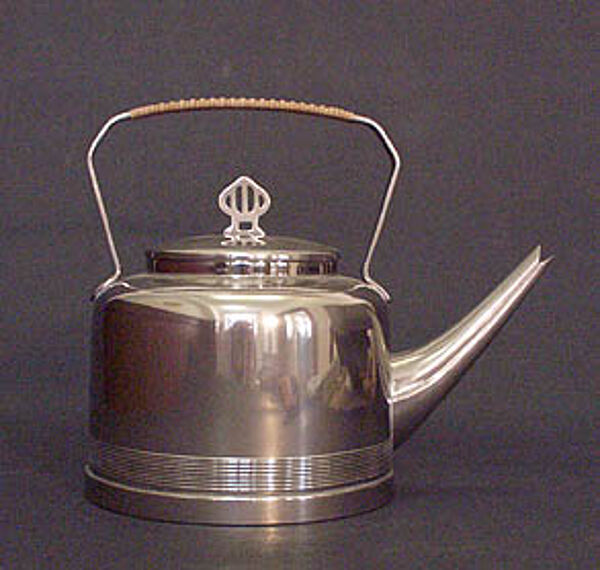 Gedrungener, zylindrischer Korpus aus vernickeltem (?) Metall mit abgerundeter Schulter und schlankem, lang ausgezogenen Gießer. Oberhalb des Stands Rillendekor. Die dominante Handhabe ist mit Bast umflochten. Der Deckelknauf ist durchbrochen, mit einem geometrischem Dekor gearbeitet. Höhe ca. 19,5cm. Minimale Gebrauchsspuren, kleine Kerbe am Deckel. Unterseitig gemarkt und bezeichnet mit "1 1/2 L", Marke zwischen 1925 und 1934.