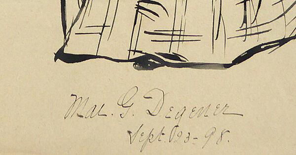 Tusche auf dünnem chamoistonigem Papier, unterhalb der Darstellung bezeichnet: "Mad. G. Degener" sowie datiert "Sept. 23 - (19)98". Blattmaße ca. 29,2 x 18,6 cm, geringe Alters-, Griff- und Lagerspuren. Rückseitig Nachlassstempel.