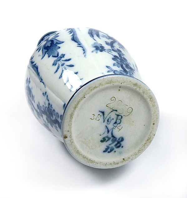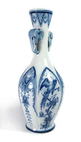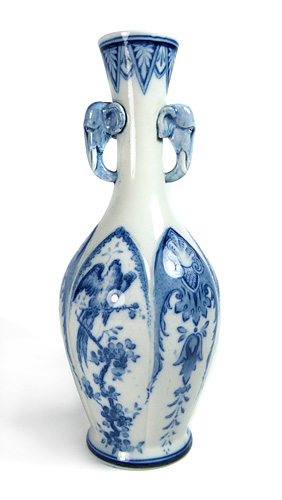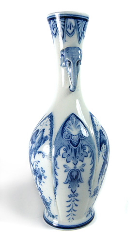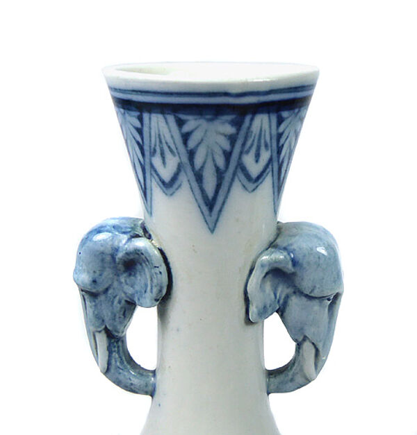 Konischer Porzellankorpus mit langem Halsteil und leicht ausgestelltem Rand. Unterhalb desselben sind zwei vollplastische Handhaben in Form von Elefantenköpfen angesetzt. Auf der Wandung filigrane Unterglasurmalerei: sechs Bögen mit orientalischen Ornamenten und Vogeldekor. Höhe ca. 19,5 cm, geringe Alters- und Gebrauchsspuren. Unterseitig blaugrüne Manufakturmarke "V & B, M", eingepresste Modell-Nr. "2269" und weitere Bezeichnungen. Wohl um 1890.