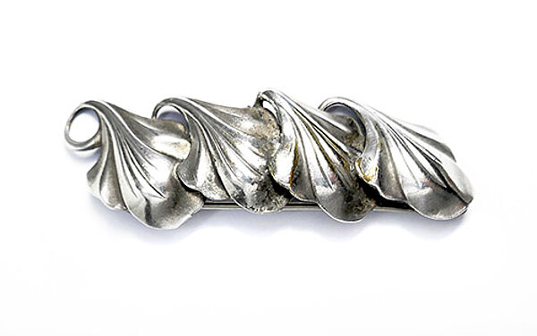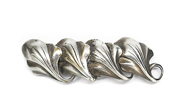 Versilberter, figürlicher, halbplastischer Korpus in Form eines leicht stilisierten, kleinen Blätterreigens. Maße ca. 5,6 x 1,8 cm, ungeputzter Zustand mit moderaten Alters- und Tragespuren, die Versilberung ist teilweise leicht berieben. Rückseitig einfache Broschierung. Ungemarkt, wohl Deutschland (Einfluss von Velde?) um 1900 bis 1910.