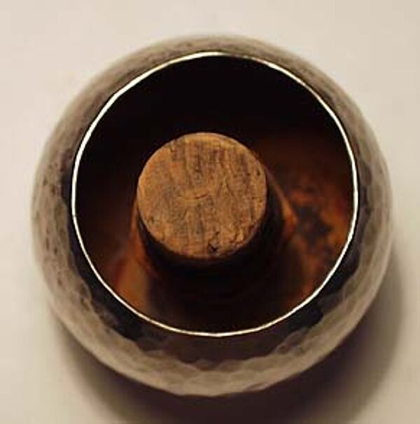Kugelförmiger Korpus (Messing versilbert) mit akzentuiertem, gleichmäßigen "Hammerschlagdekor", unbezeichnet. Der Durchmesser beträgt ca. 5 cm, die Öffnung für den Korken ca. 4 cm. Äußerlich zeigen sich einige diskrete Gebrauchsspuren, z.T. auch minimale Bereibungen, innenseitig korrosions-bedingte Verfärbung, der Korken ist schon etwas abgegriffen, mit "Patina". Insgesamt aber guter, altersgerechter Zustand.