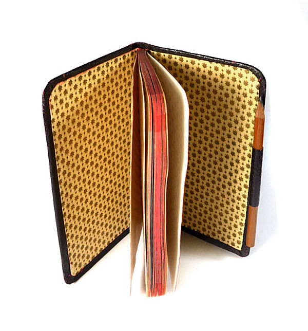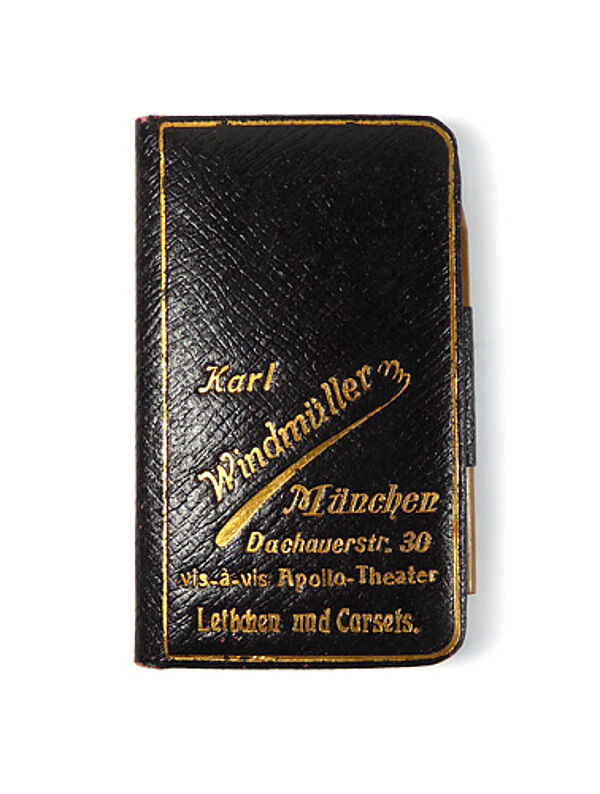 Hochrechteckiges, mit braunem Kunstleder gebundenes Notizbüchlein. Vorderseitig gold geprägte Bezeichnung "Karl Windmüller / München Dachauerstr. 30 / vis-a-vis Apollo-Theater / Leibchen und Corsets". Chamoistoniges Vorsatzpapier mit kleinen goldenen Sternen, an einer Einbandseite zarte röhrenartige Schlaufe, hier ist ein kleiner, schmaler Bleistift eingeschoben. Maße ca. 9,3 x 6 cm, minimale Lagerspuren (vergessener Lagerbestand eines Nürnberger Papierherstellers). Wohl um 1900 bis 1910.