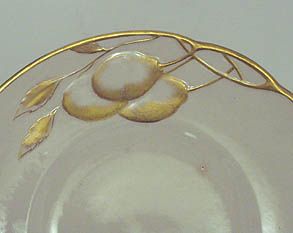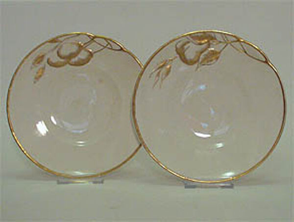 Zwei Obst- oder Zierteller, im Randbereich plastisch angelegtes Birnen- bzw. Pflaumendekor mit partieller Vergoldung akzentuiert, zudem Goldrand (hier minimale Bereibung), D. ca. 19,5cm. Unterseitig gemarkt, wohl um 1905/10.