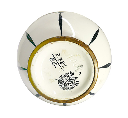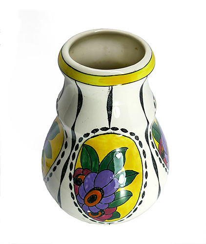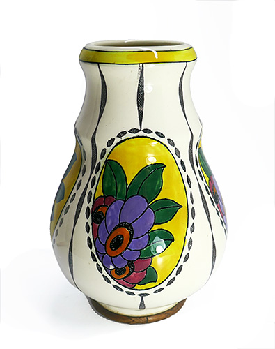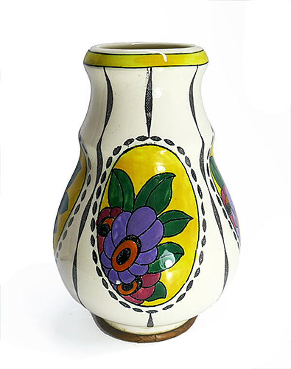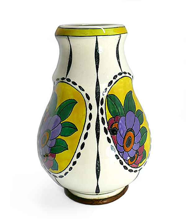 Annähernd birnenförmiger Korpus aus (vermutlich) hellem Scherben. Handgemaltes Dekor: in 4 gelb hinterlegten ovalen Kartuschen sind stilisierte Blüten in leuchtenden Farben zu sehen, eingebunden in ein schwarzes Streifenmuster. Der Fuß ist mit einem schmalen Bronzering gefasst. Höhe ca. 19 cm, geringe Altersspuren. Unterseitig Markung (zwischen 1922 - 1924) sowie (Dekor?)Nummer "D.781" und weitere geritzte Nummer "1000".