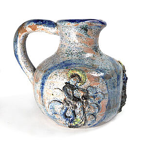 Kleiner, expressiver Keramikweinkrug mit figürlichen Darstellungen