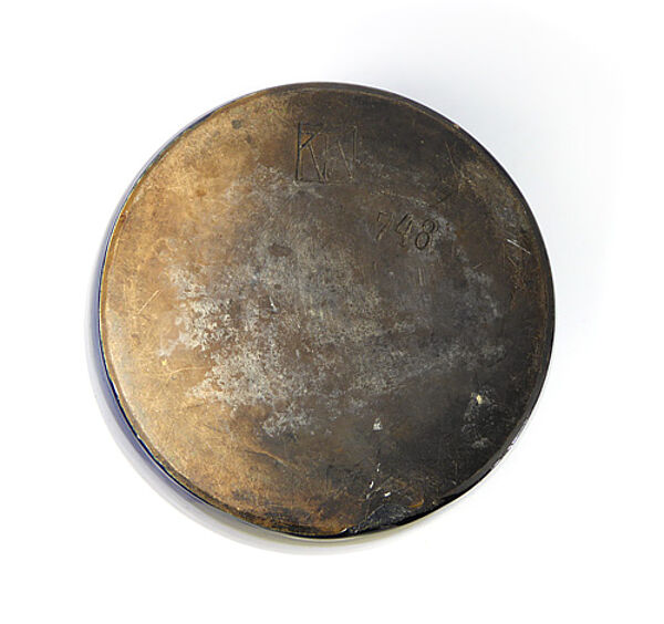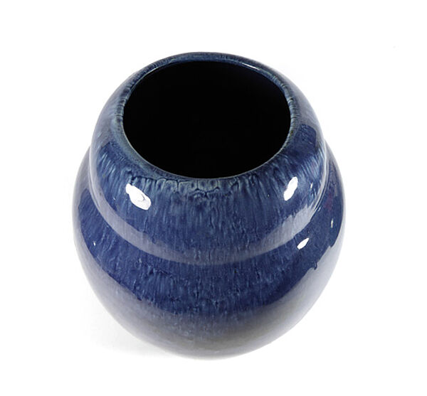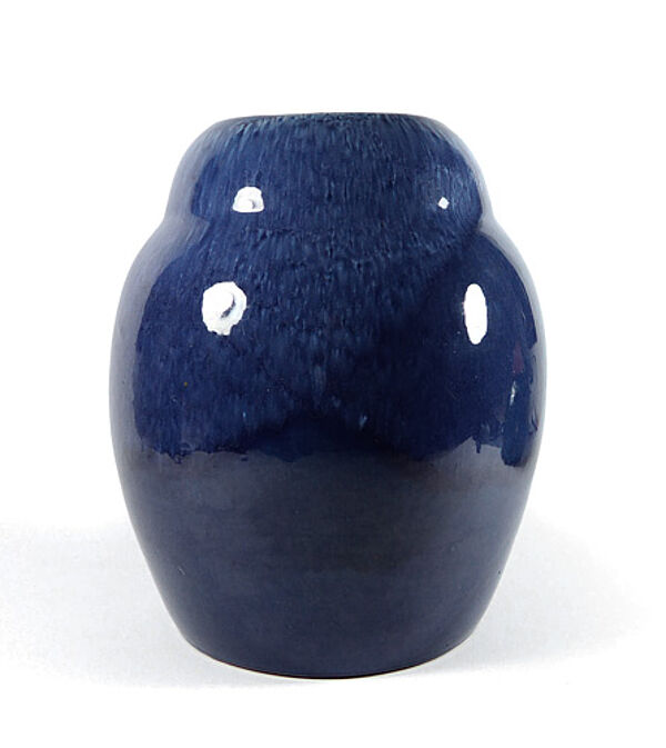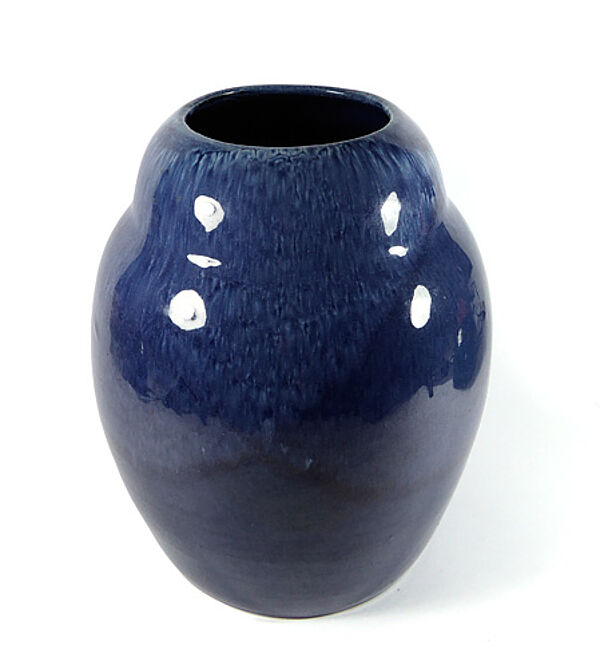 Annähernd ovoider Korpus aus ziegelrotem Scherben, im Halsbereich leicht tailliert. Glänzende Laufglasur in leuchtenden Blautönen. Höhe knapp 23 cm, geringe Gebrauchs- und Altersspuren, teilweise leichtes Alterscraquelée, der Stand ist an einer Stelle minimalst bestoßen. Unterseitig Markung sowie Modell-Nummer "748". Wohl um 1905 bis 15. Wenn der Entwurf nach 1912/13 entstanden sein sollte (also nach dem Ausscheiden Max Laeugers aus Kandern), wäre der Entwurf von seinem Nachfolger Hermann Hakenjos sen. (Provenienz: Slg. Georg Brühl; Heickmann / Chemnitz).