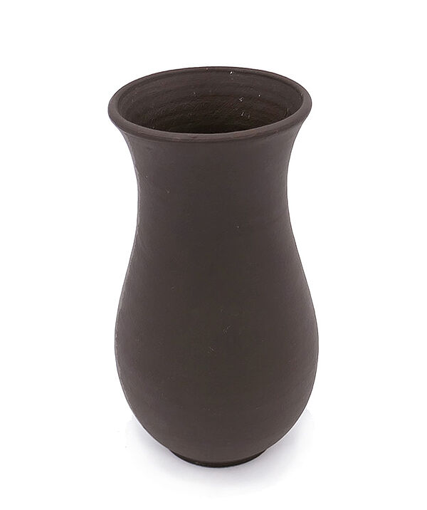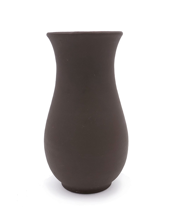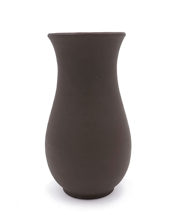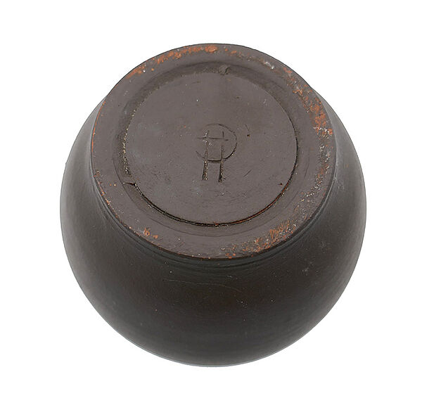 Im unteren Drittel flach konvex gebauchter, im oberen Drittel flach konkav taillierter, handgedrehter Korpus aus rötlich-braunem Scherben auf flachen Fuß. Monochrom braun engobiert. Höhe ca. 15 cm, geringe Altersspuren. Unterseitig gemarkt. Wohl Ende 1920er bis 40er Jahre (die Werkstattgründung war 1926).