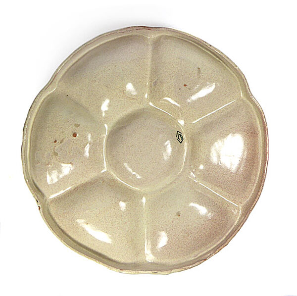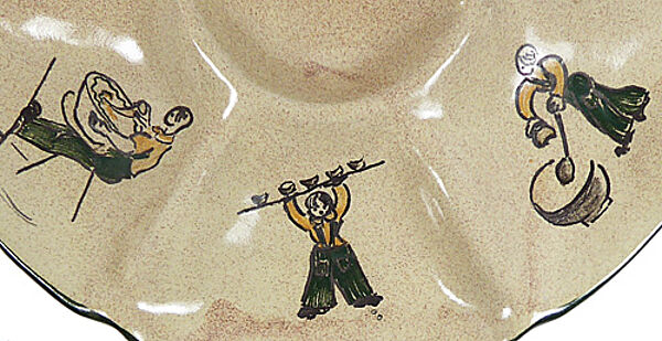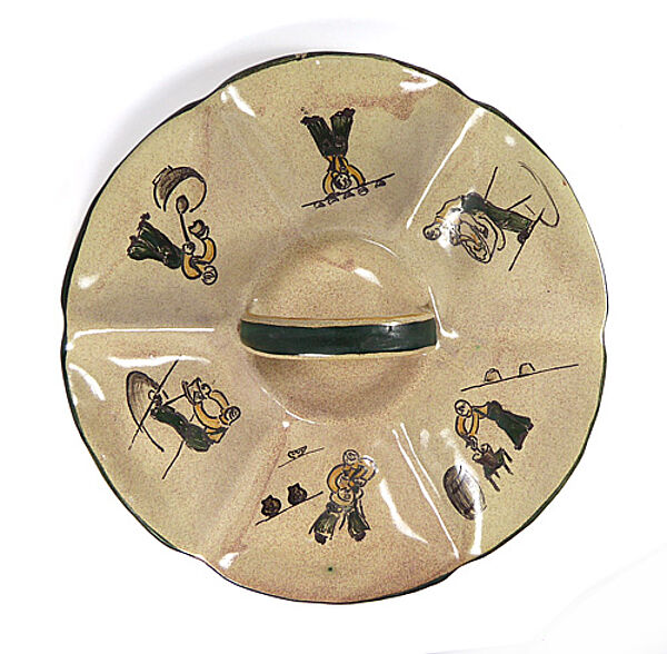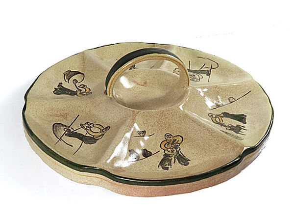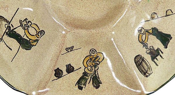 Annähernd runder Keramikkorpus aus hellem Scherben, der oberseitig entlang des grün glasierten Randes sechs muldenförmige Vertiefungen aufweist, auf deren Grund jeweils eine handgemalte, skizzenhafte Szene aus der Arbeitswelt der Töpfer dargestellt ist. Mittig befindet sich - eine zentrale siebente Mulde überspannend - eine C-förmige, oberseitig grün glasierte Handhabe. Ansonsten beige-farbene Grundglasur. Durchmesser ca. 31,5 cm, geringe Altersspuren (an einer Stelle weist der grün glasierte Rand eine kleine Farbbereibung auf). Wohl Deutschland oder Dänemark der 1920er bis 40er Jahre.