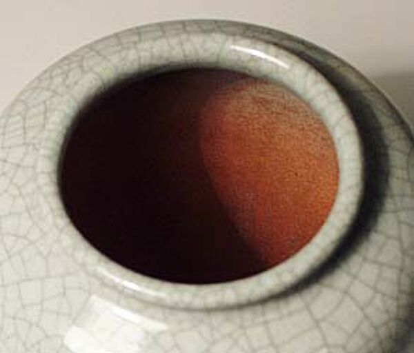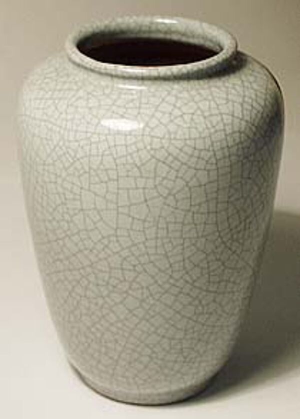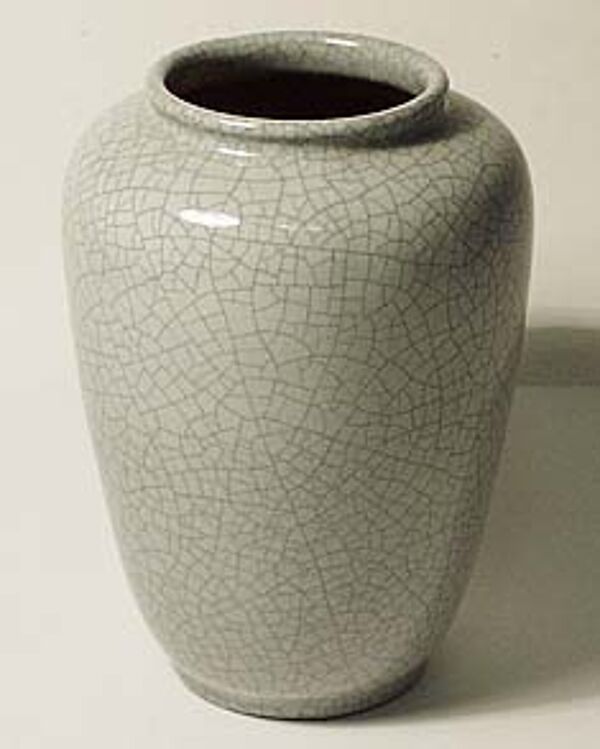 Im Schulterbereich deutlich gewölbter, sich konisch zum Stand verjüngender Korpus, leicht ausgestellter Mündungsrand. Hellbrauner Scherben mit weiß-grauer Craquelée-Glasur. Höhe knapp 14 cm. Unterseitig gemarkt sowie bezeichnet mit "5654". Ausführung zwischen 1950 und 1962.