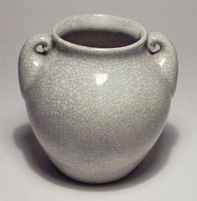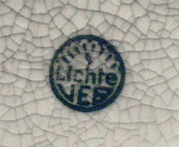 Amphorenartiger Korpus mit zwei Handhaben, die bis unterhalb des Mündungsrandes reichen. Heller Scherben mit hellgrauer Craquellée-Glasur. Maße: Höhe ca. 10 cm, Durchmesser Öffnung: 6 cm, unterseitig gemarkt "VEB Lichte". Ausführung wohl in den 50er Jahren, vermutlich im VEB Keramik-Zweigbetrieb Porzellanfabrik Lichte (Marke allerdings nicht im Handbuch des Europäischen Porzellans von Danckert enthalten), der Formentwurf dürfte aber auf die 20er oder 30er Jahre (der Gebr. Heubach AG)zurückgehen.