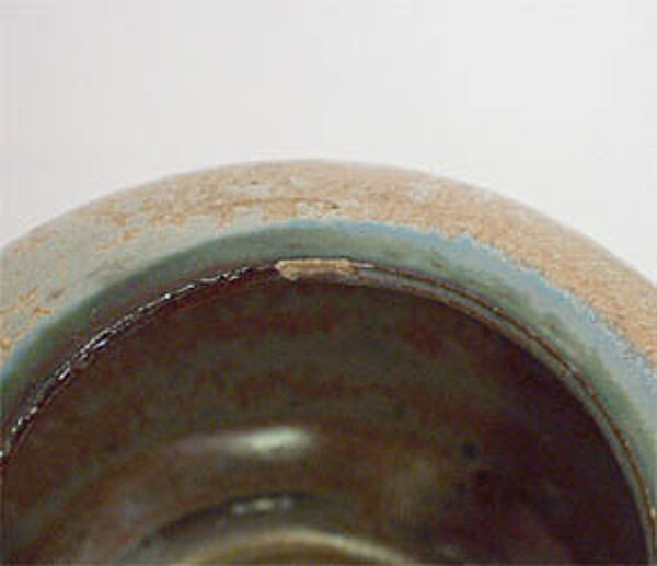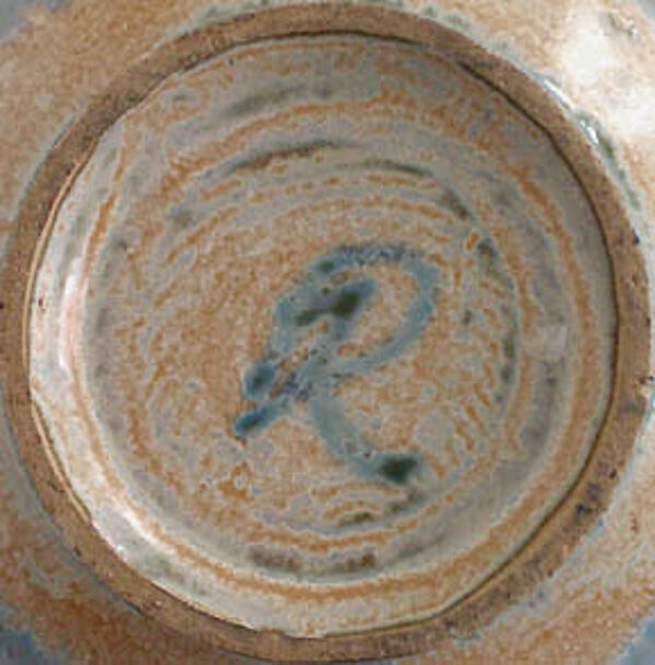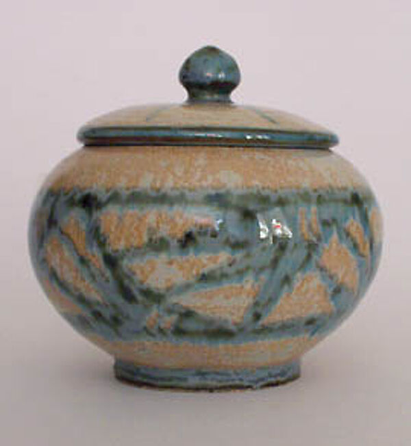 Deckeldose mit angedeutet kugelförmigem Korpus, Deckelknauf. Beige gesprenkelte Glasur mit grünblauem Bandmuster. Höhe ca. 11,5 cm, kleine Glasurabplatzung am inneren Rand, äußerl. nicht sichtbar. Unterseitig gemarkt, wohl 20er Jahre.