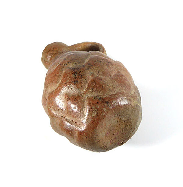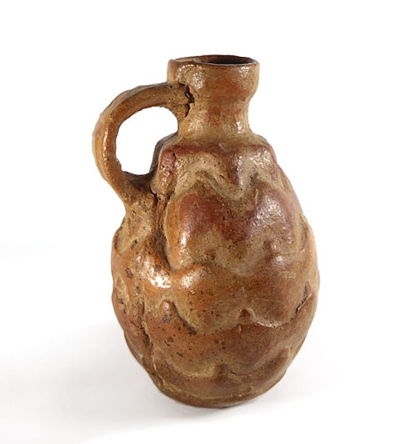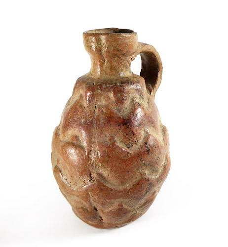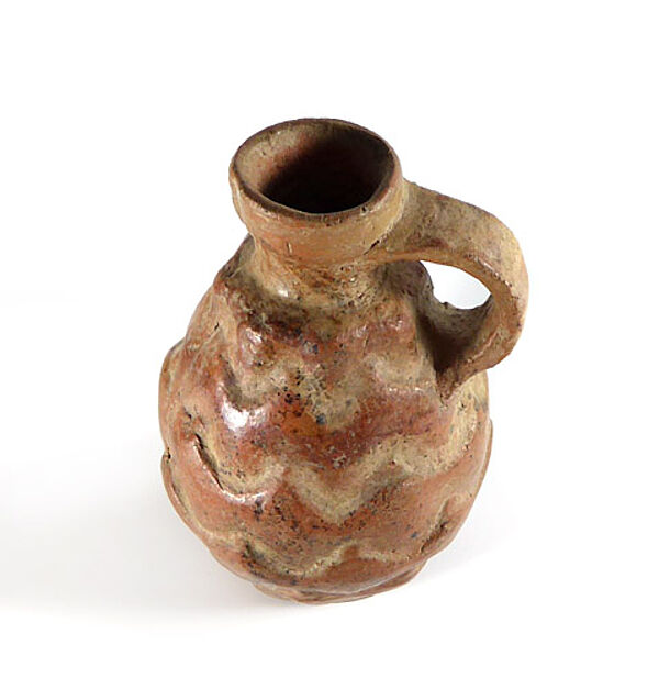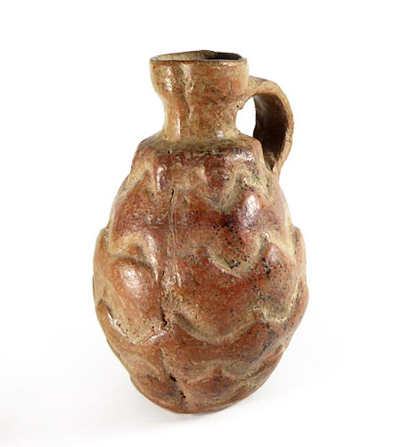 Korpus aus rötlichem Ton, die Wandung weist eine reliefierte Schuppenstruktur auf, die an eine Frucht erinnert. C-förmige Handhabe. Höhe ca. 16 cm, kleine Beschädigung am Henkelansatz, sonst intakt. Wohl ca. 900 - 1470 nach Christi.