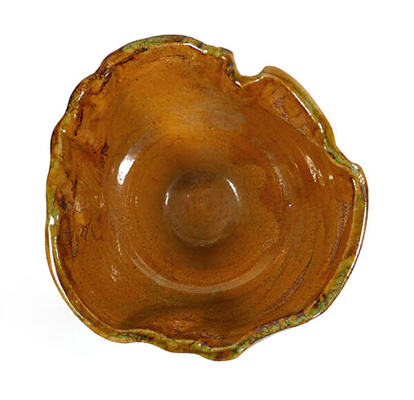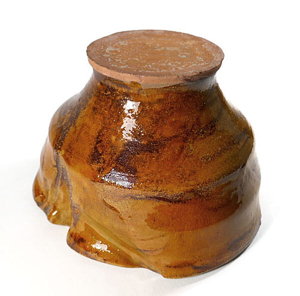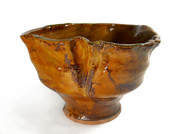 Gefußter Korpus aus hellrotem Scherben (der Ton stammt von der Baustelle der hallischen Hochstraße), gedrehte, partiell eingedrückte Form. Orange-braune Glasur mit stellenweise leichten Changierungen ins Dunkelbraune und Hellgrüne. Höhe ca. 12 cm, geringe Altersspuren. Die Schale ist unsigniert. Wir haben sie aber direkt von der Künstlerin erworben. Sie entstand in ihrer hallischen Zeit um 1974.