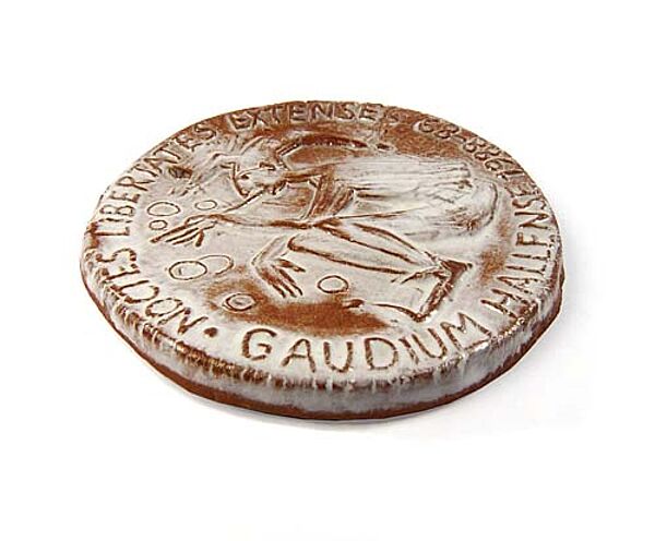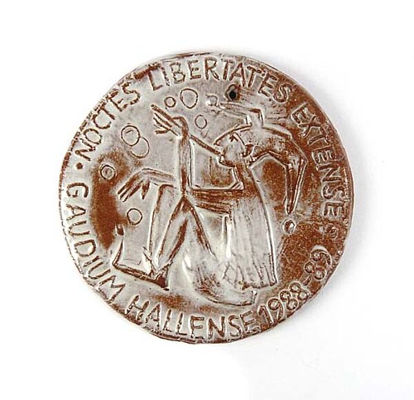Einseitige Keramik-Medaille anläßlich des Mediziner-Faschings in Halle 1988/89. Dargestellt ist ein sitzender, Seifenblasen blasender Harlekin. Entlang des Randes Bezeichnung: "NOCTES LIBERTATES EXTENSE . GAUDIUM HALLENSE . 1988 / 89". Brauner Scherben, Rückseite unglasiert, vorderseitig helle, fast weiße, semitransparente Glasur. Durchmesser ca. 6,6 cm.