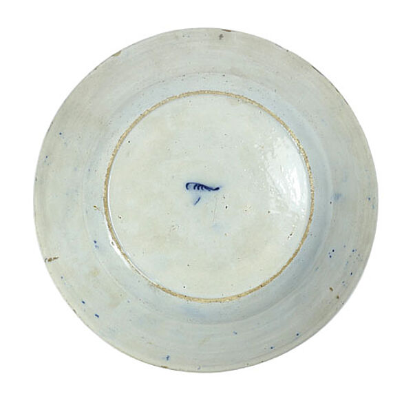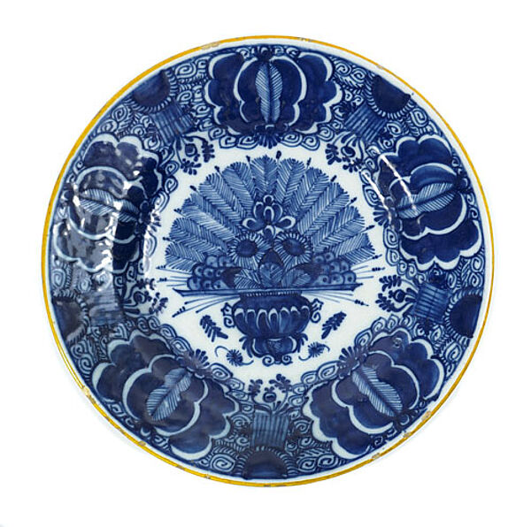 Keramikkorpus mit blauer Fayencemalerei auf weißem Grund: im Spiegel stilisierte, zeittypische Blumenvase; auf Fahne Floralbordüre; schwefelgelber Rand. Durchmesser ca. 23,5 cm, Höhe ca. 3,8 cm, geringe Altersspuren, so zeigen sich im Randbereich einige kleine Chips. Rückseitig Blaumarke. Delft, 18. Jahrhunderts.