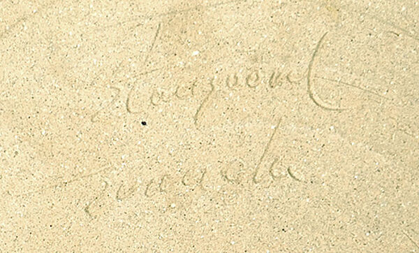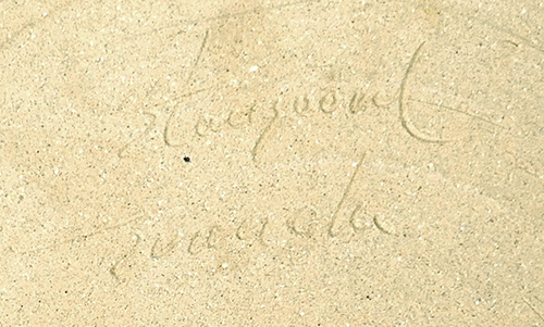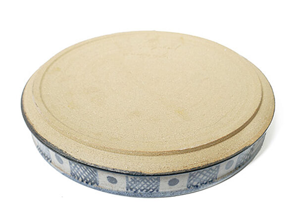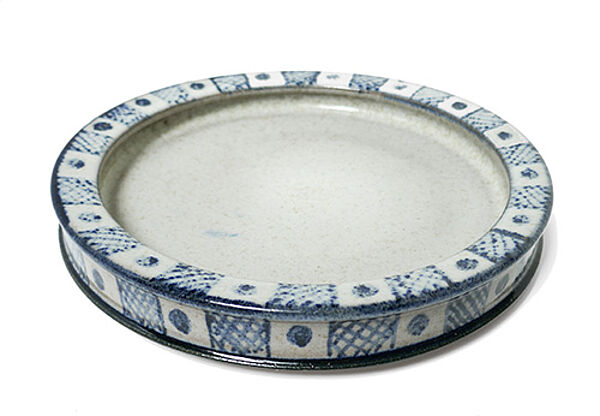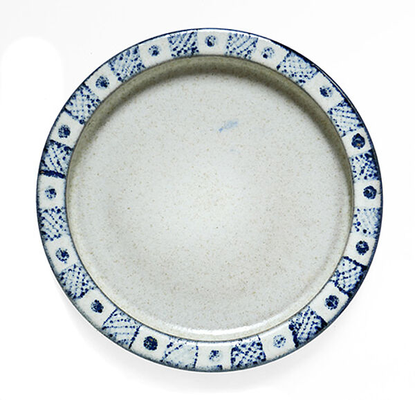 Scheibenförmiger Korpus mit flachem, breitem, innen etwas eingezogenem Rand aus hellem Scherben. Hellgraue Grund(evtl. Salz)glasur, außen und oberseitig auf dem Rand handbemaltes, abstraktes Dekor (Flächen und Punkte) in Blau. Durchmesser ca. 27 cm, Höhe ca. 4,5 cm, geringe Altersspuren. Unterseitig signiert. Wohl 1960er Jahre.